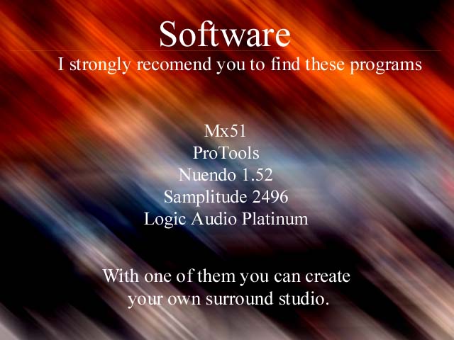 Digital audio software for making surround music: Here are some of the most important programs for making surround music. Imagine that you can "move" the position of the sound in real time. Move some sounds to front, then to left, then to right. And if you really have 6 speakers placed in your room you can feel the sound moving. Real Surround in real time. First you can download the demo version of SekD Samplitude 2496. The demo is workable.